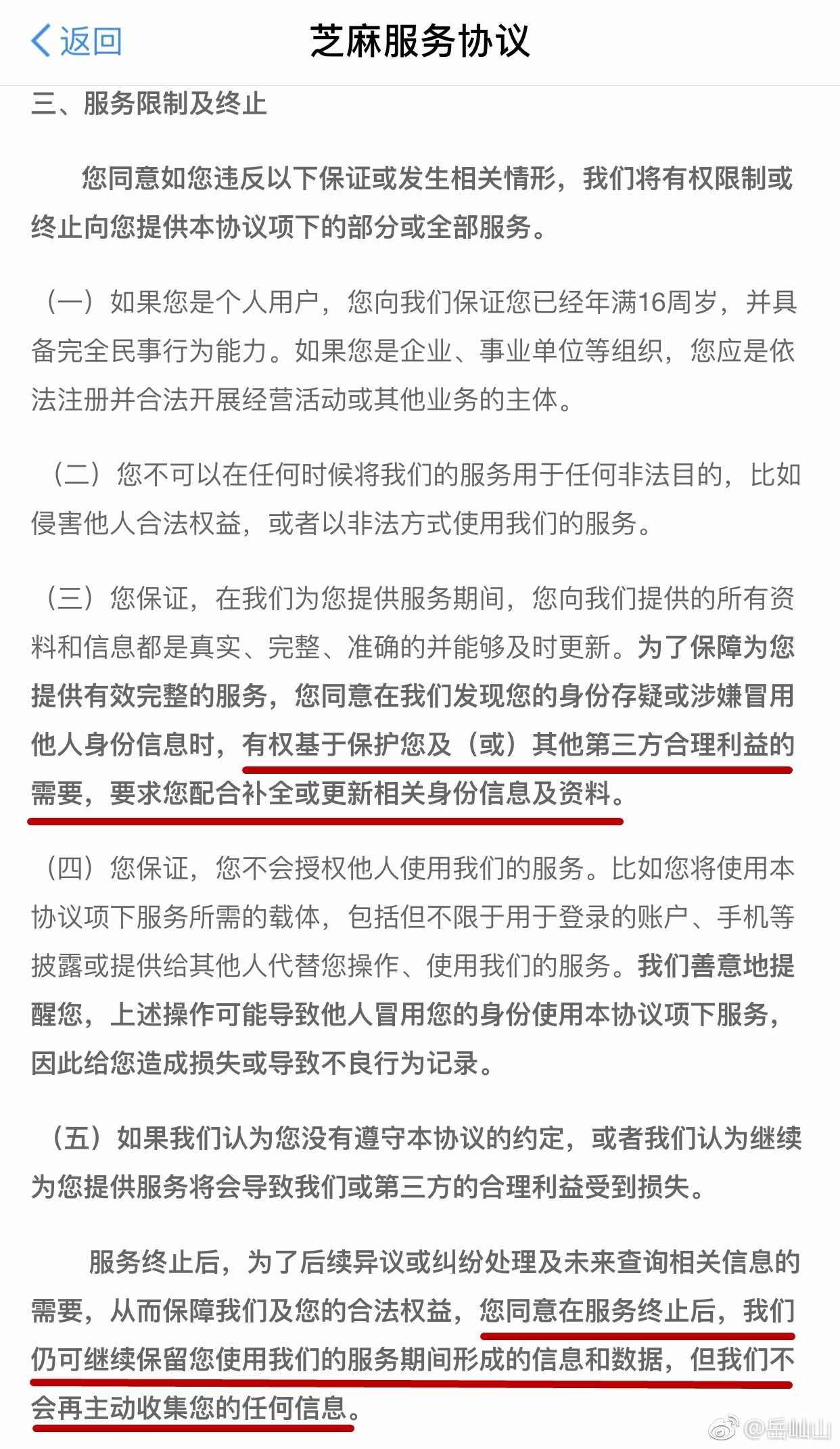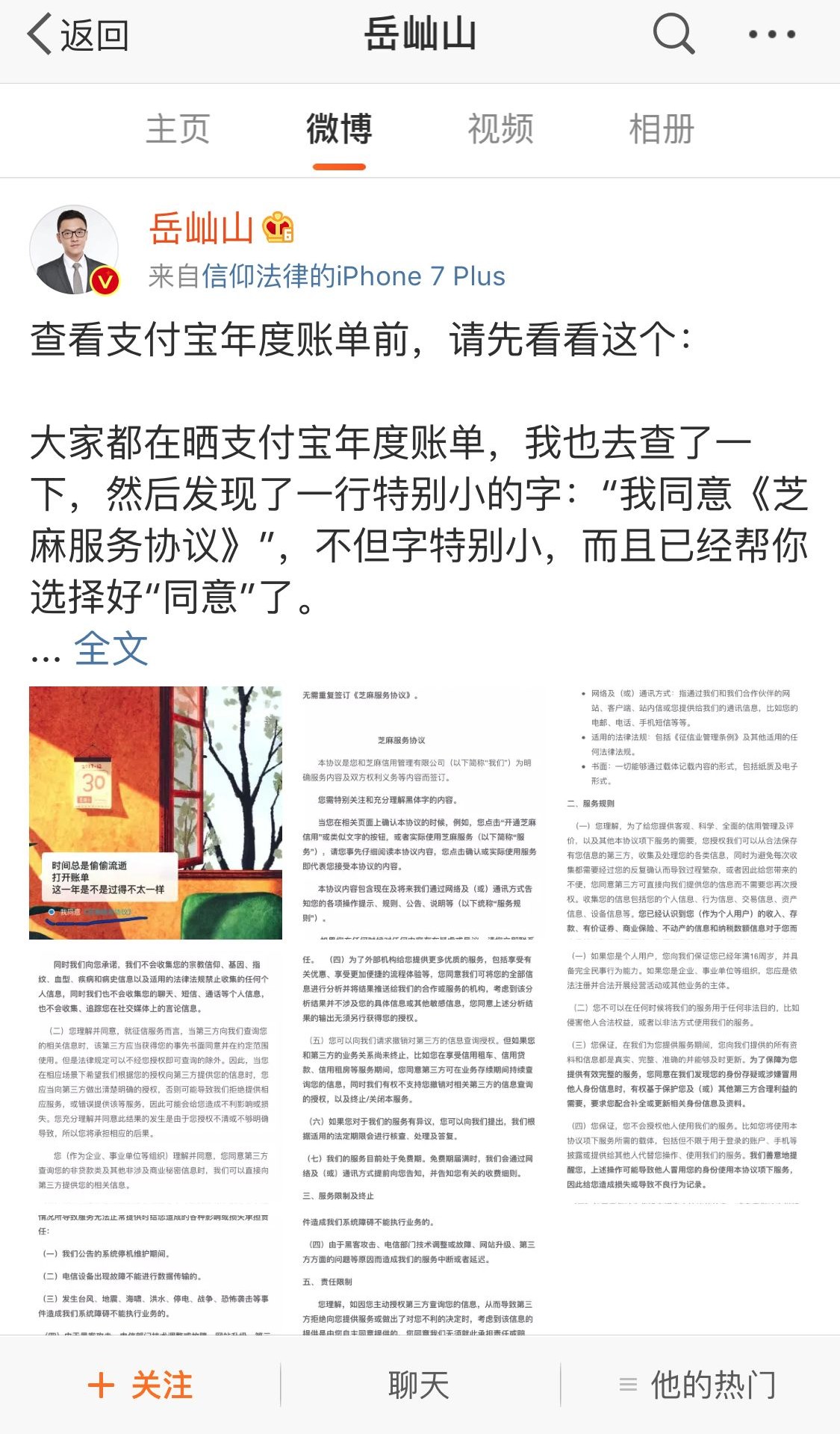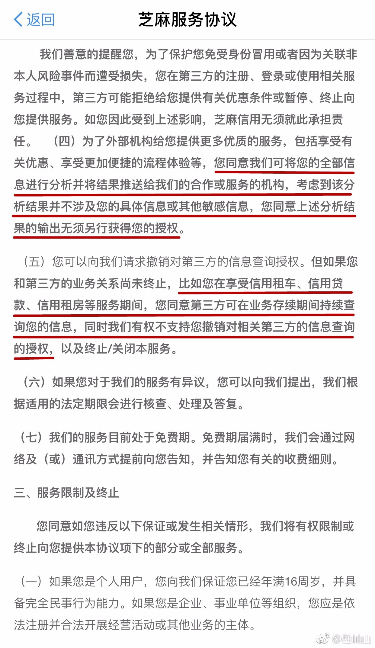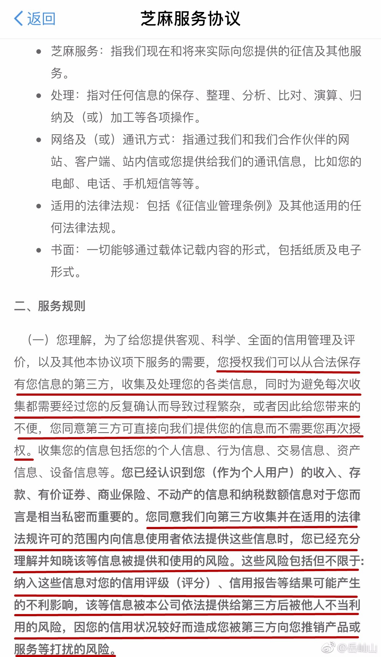 岳屾山在微博中说,根据《互联网交易管理办法》的规定,经营者应当采用显著的方式提请消费者注意与消费者有重大利害关系的条款。同时对于信息收集,该规定要求经营者需要明示收集、使用信息的目的、方式和范围,并经被收集者同意。而“芝麻”这个根本不给你了解条款的机会,直接让你默认同意,稍不注意就进坑了。