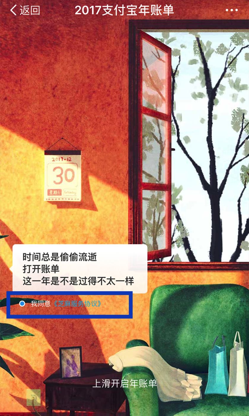 据岳屾山介绍,这个账单的查看和《芝麻服务协议》没有关联性,所以你选择取消同意,依然能够看到年度账单。但如果你没注意到,就会直接同意这个协议,允许支付宝收集你的信息包括在第三方保存的信息。